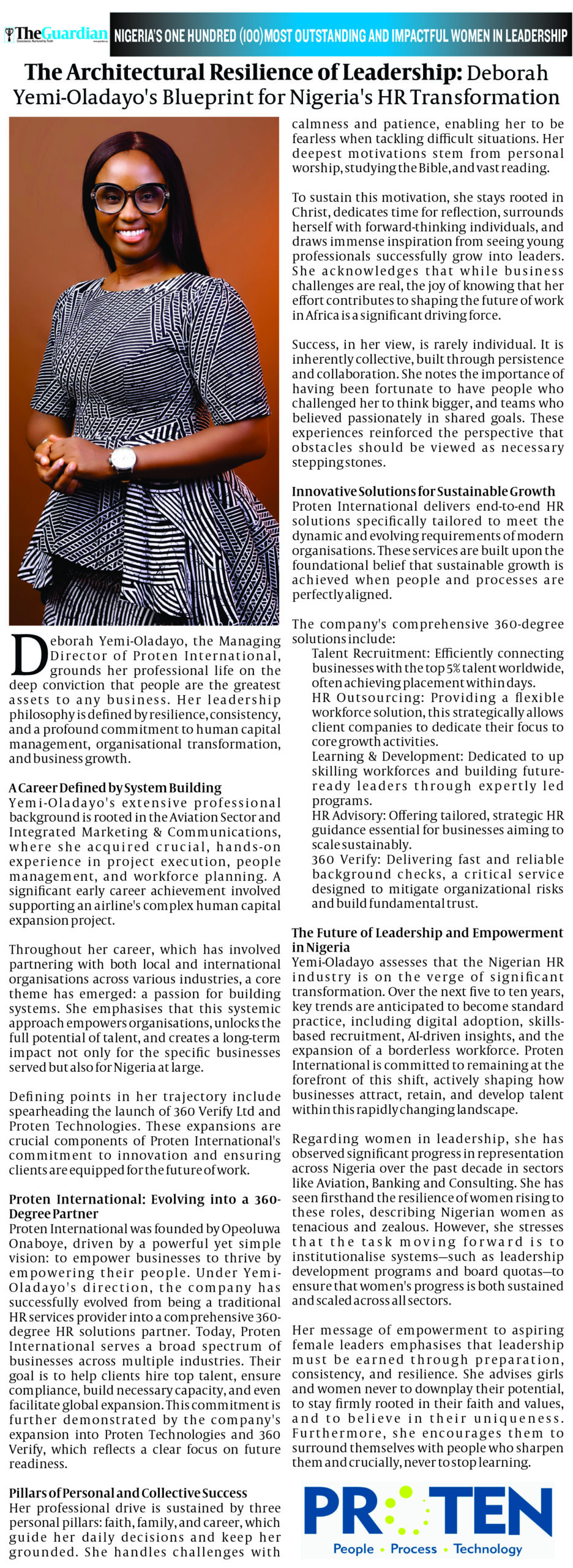 Proten International is proud to celebrate a remarkable milestone as our Managing Director, Deborah Yemi-Oladayo, has been named one of The Guardian’s 100 Most Outstanding and Impactful Women in Leadership 2025. This prestigious recognition honours visionary women whose work is shaping industries, transforming societies, and redefining leadership across Africa and beyond.